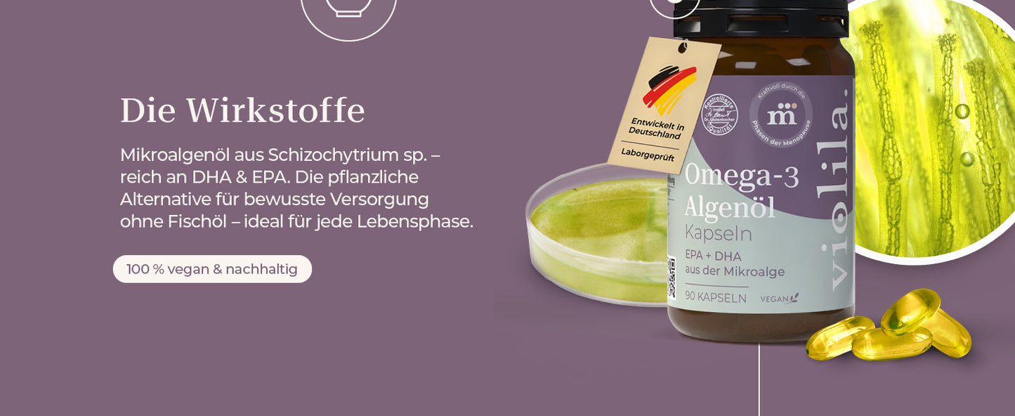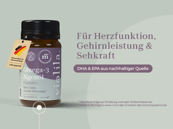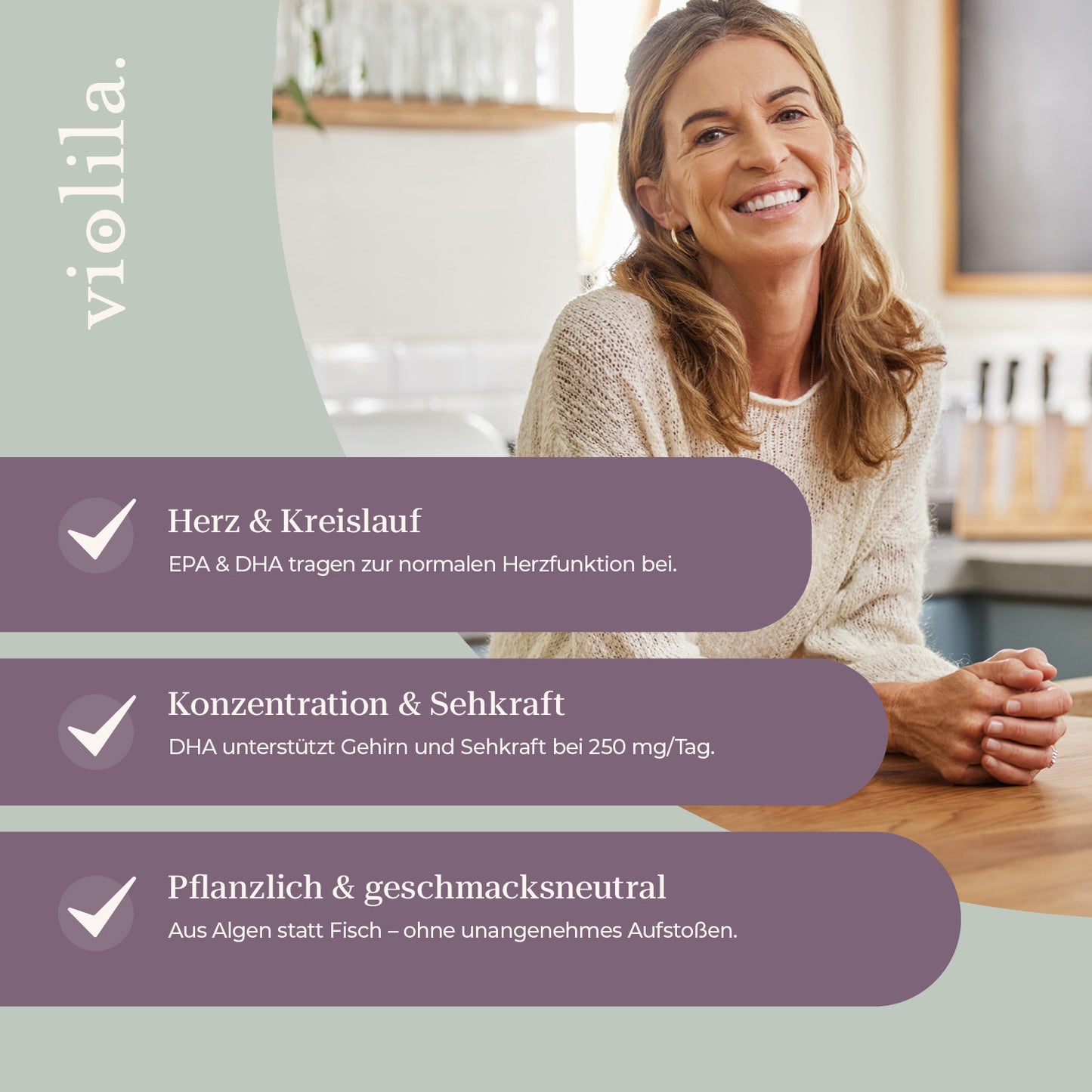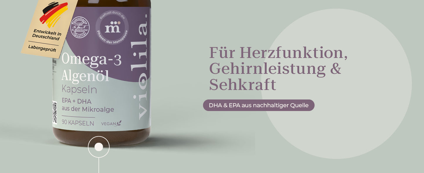 In den Wechseljahren können Konzentration, Stimmung und Herz-Kreislauf-Balance stärker gefordert sein. DHA unterstützt in dieser Lebensphase die normale Funktion von Gehirn und Sehkraft, EPA und DHA gemeinsam die Herzgesundheit. Violila Omega-3 Algenöl Kapseln bieten hierfür eine pflanzliche Lösung – sanft, verträglich und ohne Fischöl.