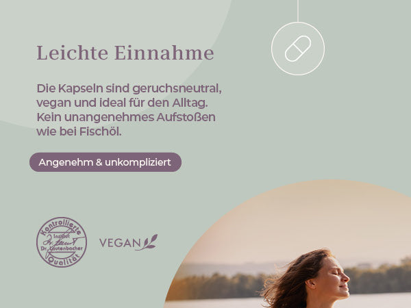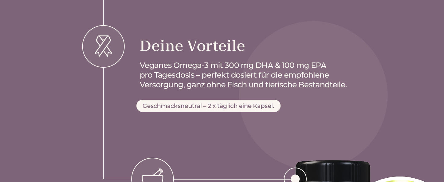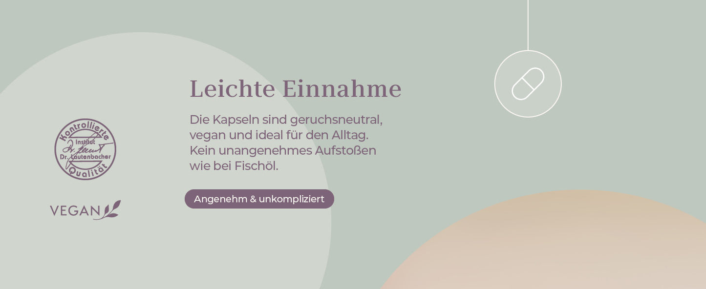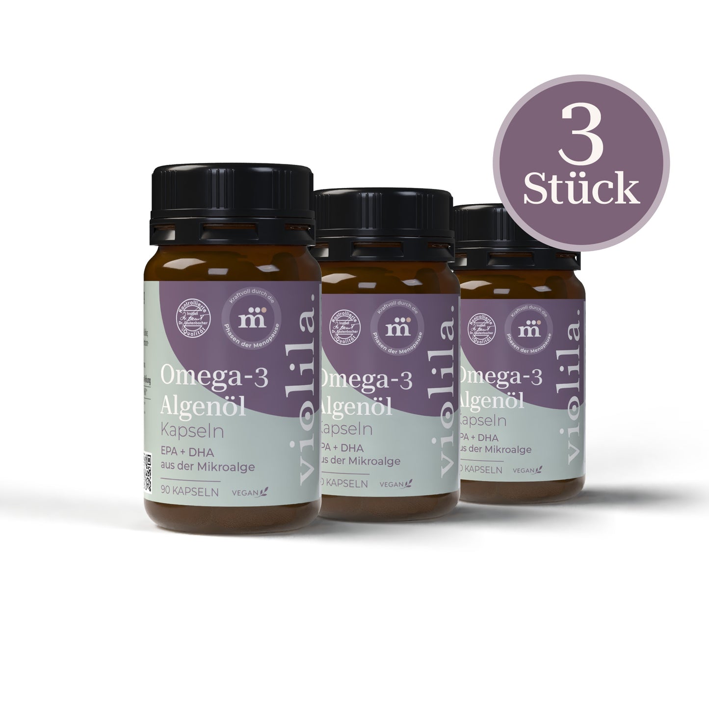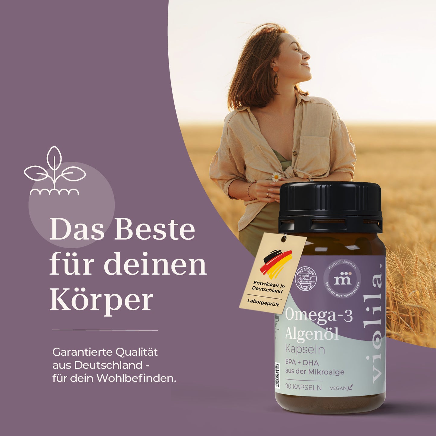 In den Wechseljahren können Konzentration, Stimmung und Herz-Kreislauf-Balance stärker gefordert sein. DHA unterstützt in dieser Lebensphase die normale Funktion von Gehirn und Sehkraft, EPA und DHA gemeinsam die Herzgesundheit. Violila Omega-3 Algenöl Kapseln bieten hierfür eine pflanzliche Lösung – sanft, verträglich und ohne Fischöl.