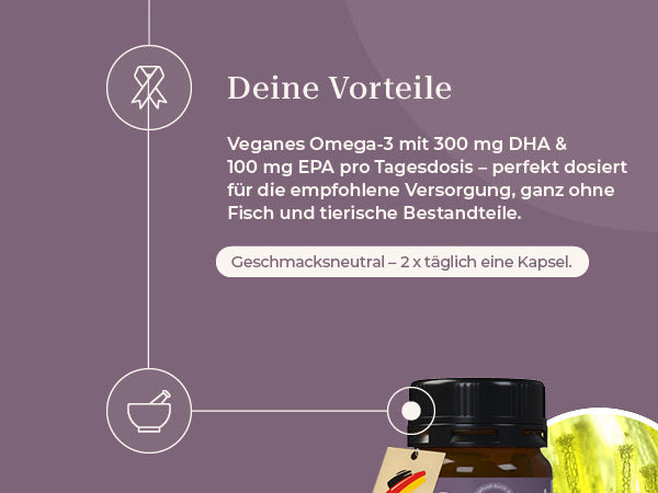 Omega-3 Algenöl Kapseln lassen sich unkompliziert in den Alltag integrieren – ganz ohne Fischgeschmack. Zwei Kapseln pro Tag liefern 300 mg DHA und 100 mg EPA – ein gezielter Beitrag zur Erhaltung von Herzfunktion, Sehkraft und geistiger Leistung. Ideal für alle, die sich pflanzlich ernähren oder bewusst auf eine nachhaltige Omega-3-Versorgung achten.