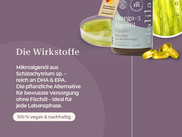 Violila Omega-3 Algenöl Kapseln bieten eine hochwertige Alternative zu Fischöl – ganz ohne tierische Bestandteile. Das enthaltene Öl stammt aus der Mikroalge Schizochytrium sp., die von Natur aus reich an den langkettigen Omega-3-Fettsäuren DHA (Docosahexaensäure) und EPA (Eicosapentaensäure) ist. Diese mehrfach ungesättigten Fettsäuren übernehmen im Körper wichtige Aufgaben: