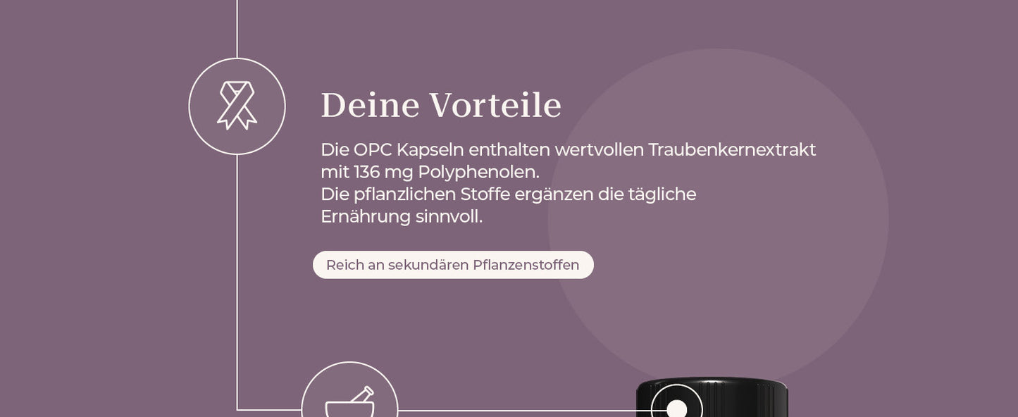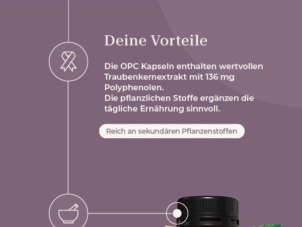 Eine Kapsel täglich genügt, um den Körper mit einer hochwertigen Dosis an sekundären Pflanzenstoffen aus der roten Traube zu versorgen. OPC ergänzt pflanzlich orientierte Ernährungsweisen – ideal im Rahmen eines ausgewogenen, gesundheitsbewussten Lebensstils. Dank der guten Verträglichkeit und veganen Rezeptur lässt sich OPC unkompliziert in die tägliche Routine einbauen.