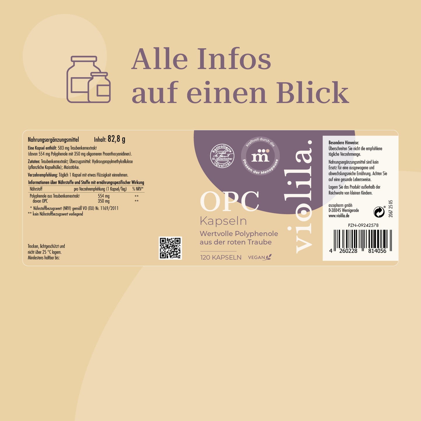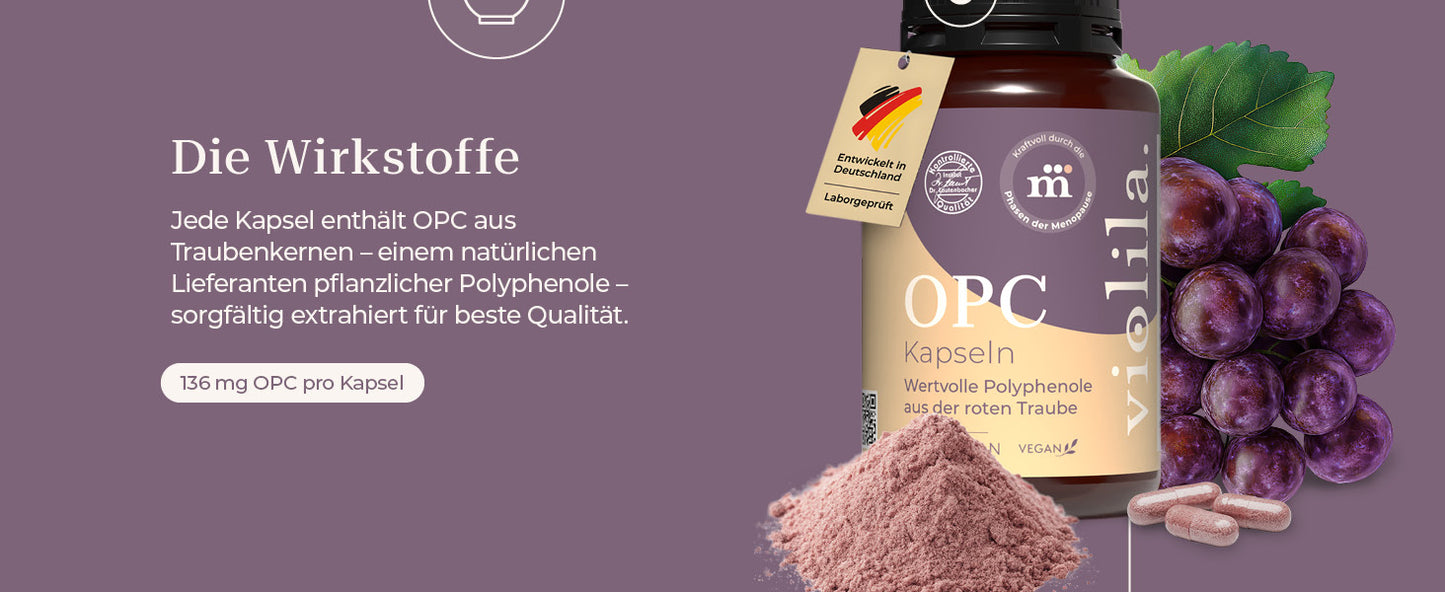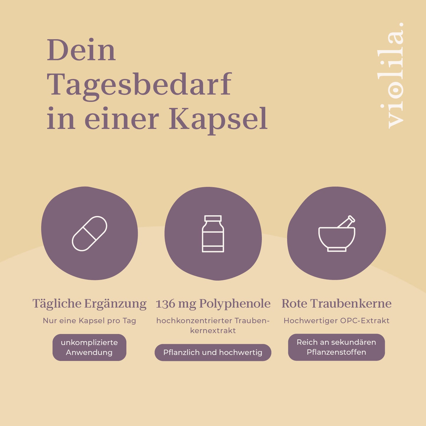 Jede Kapsel enthält 583 mg reinen Traubenkernextrakt – davon 554 mg Polyphenole und 350 mg OPC. OPC steht für „oligomere Proanthocyanidine“ – bioaktive Verbindungen, die in der Natur als Schutzstoffe gegen Oxidation und Umwelteinflüsse wirken.