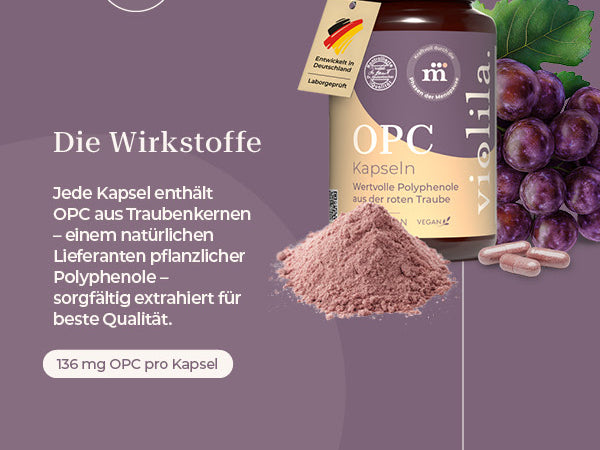 Violila OPC Kapseln liefern hochwertigen Extrakt aus Traubenkernen (Vitis vinifera), standardisiert auf einen besonders hohen Gehalt an Polyphenolen und OPC. Diese sekundären Pflanzenstoffe gehören zur Gruppe der Flavonoide und kommen natürlicherweise in den Kernen und Schalen roter Trauben vor.