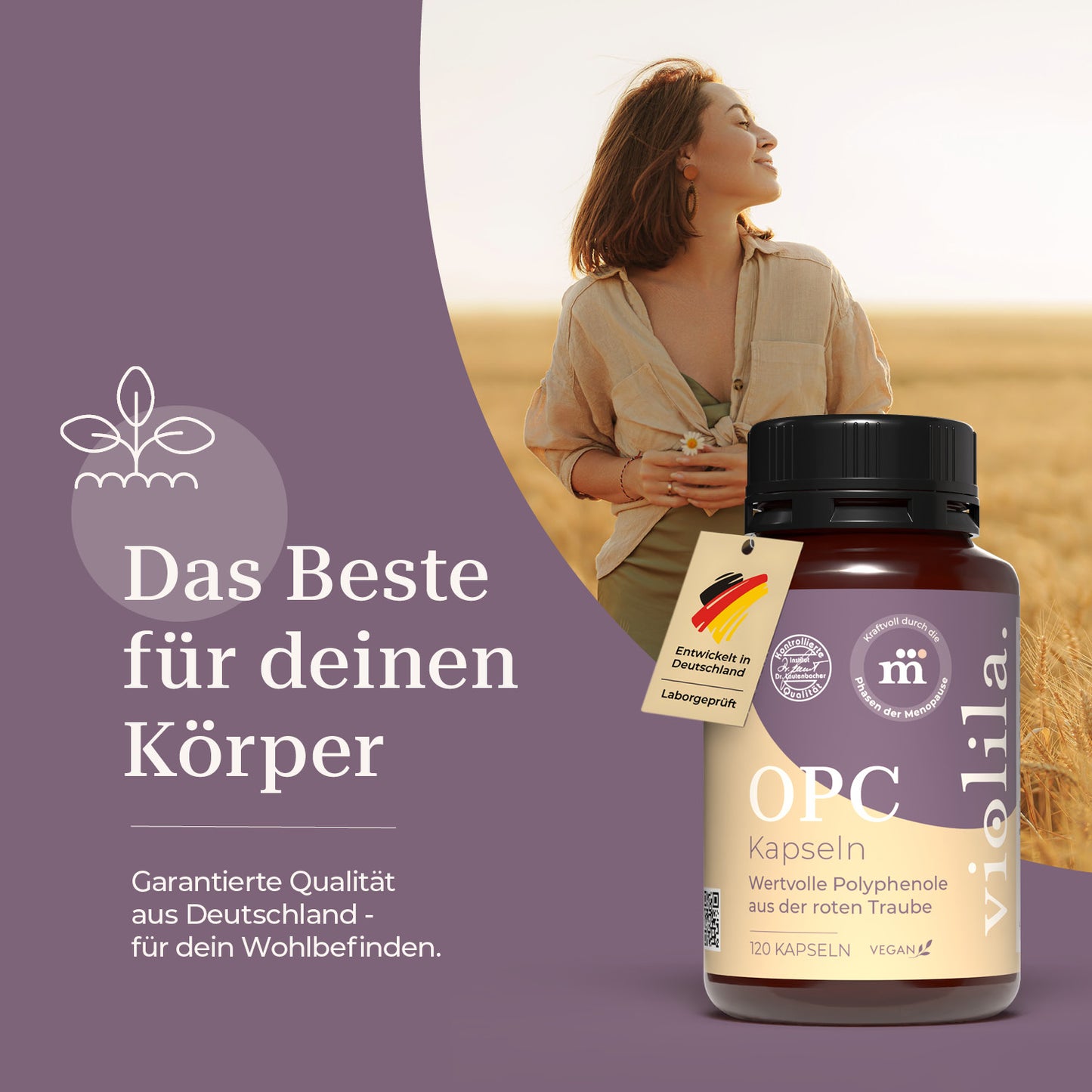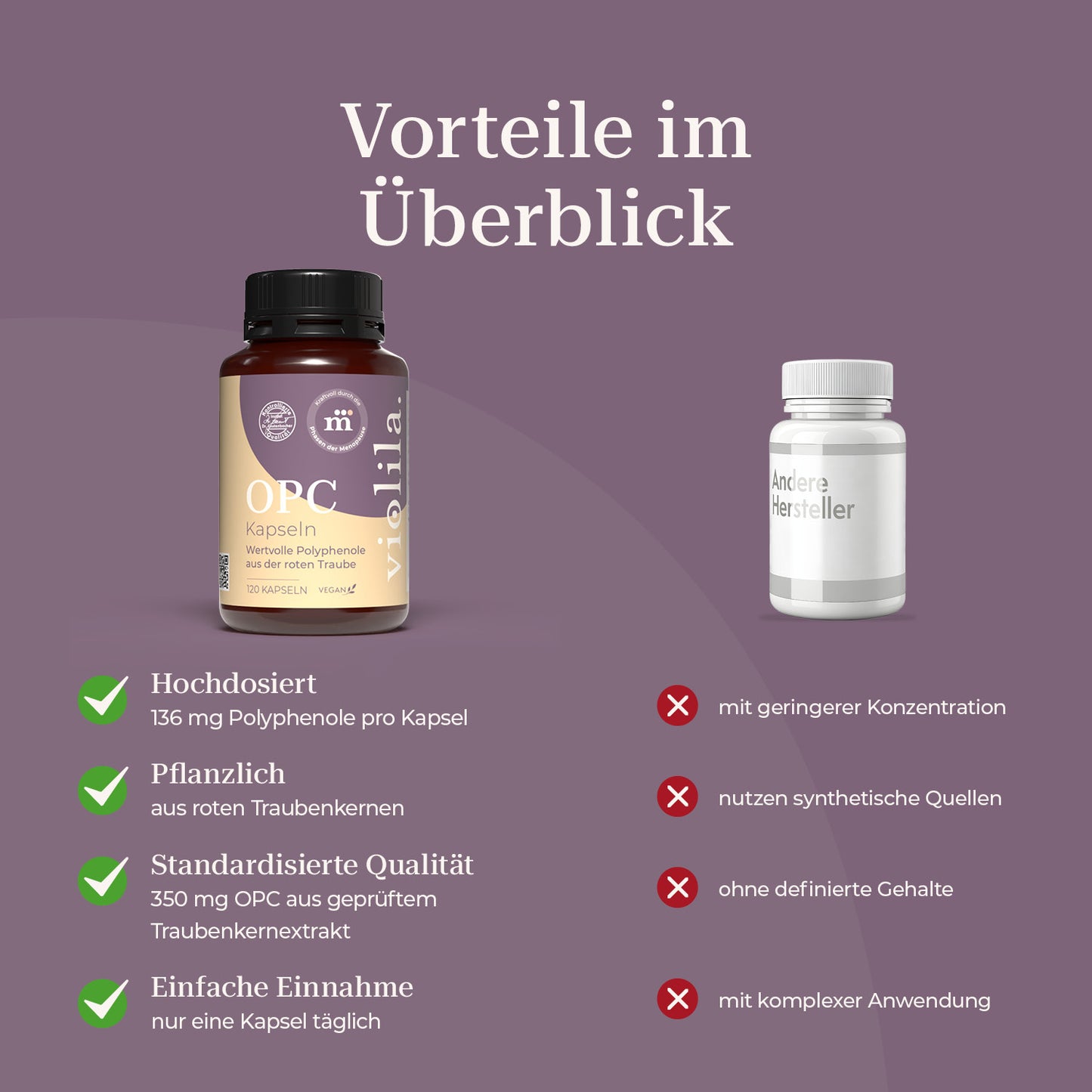 Violila OPC ist rein pflanzlich, frei von tierischen Inhaltsstoffen und eine praktische Möglichkeit, die Ernährung um hochwertige Traubenpolyphenole zu ergänzen – für alle, die bewusst leben und auf natürliche Inhaltsstoffe setzen.