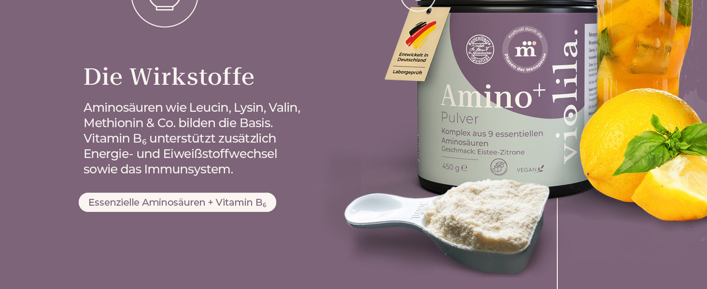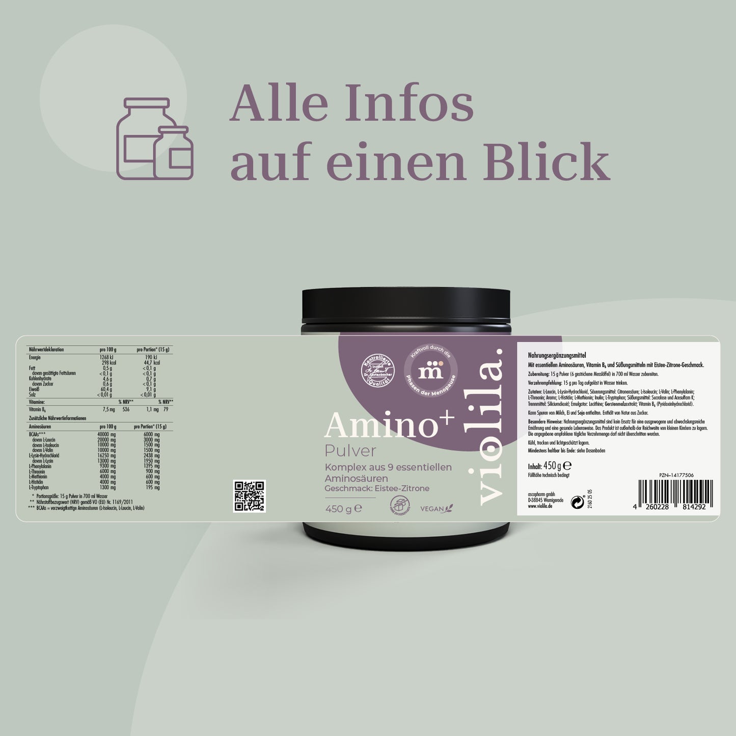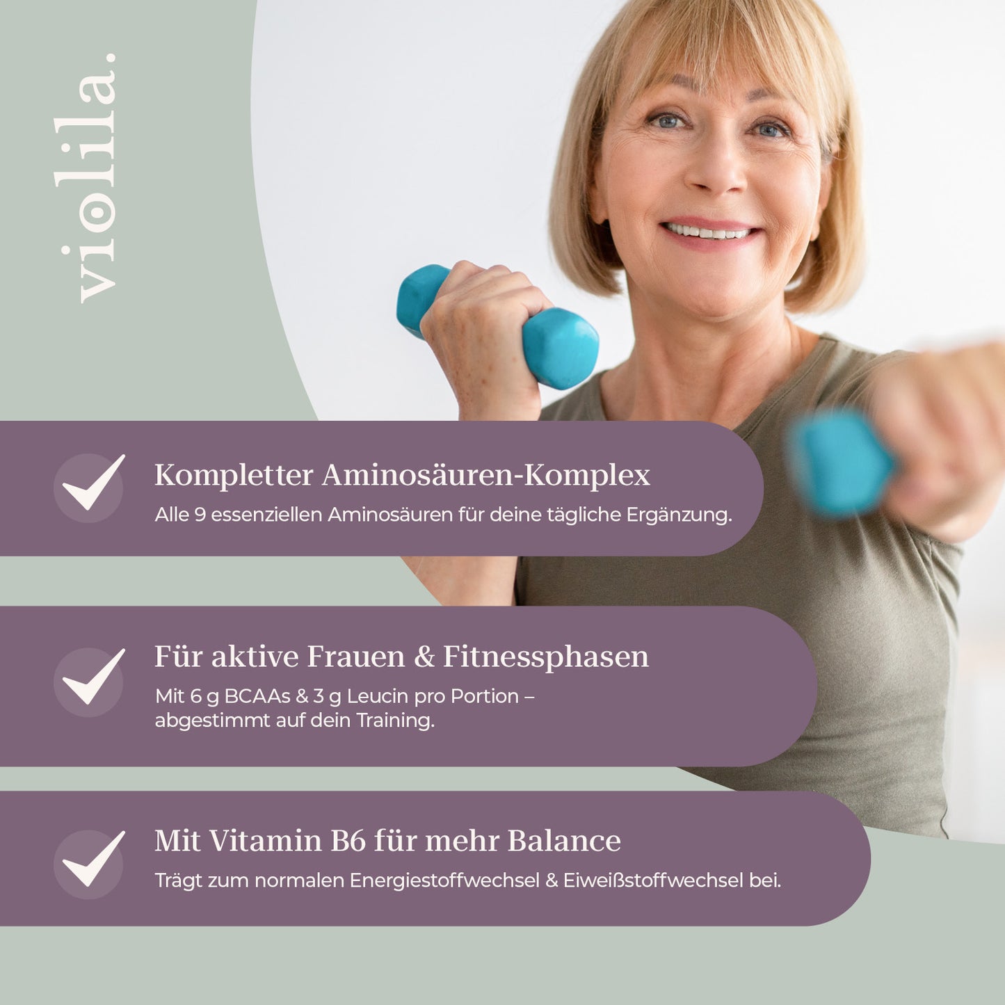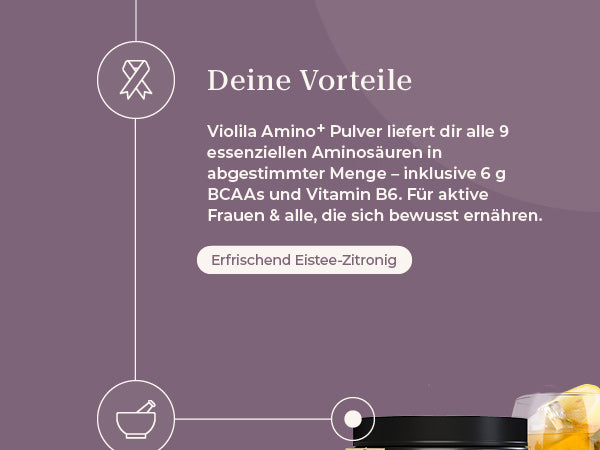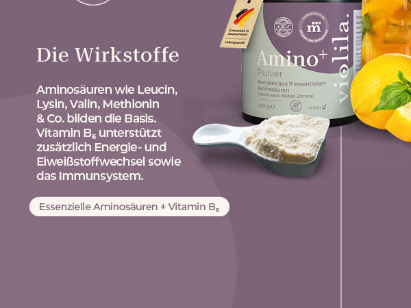 Violila Amino⁺ Pulver liefert alle neun essenziellen Aminosäuren in optimaler Kombination: Leucin, Isoleucin, Valin (als BCAAs), sowie Lysin, Methionin, Threonin, Phenylalanin, Histidin und Tryptophan. Diese Aminosäuren kann der Körper nicht selbst herstellen – sie müssen regelmäßig über die Ernährung aufgenommen werden. Mit 3 g Leucin pro Portion ist die Formulierung speziell für aktive Frauen geeignet, die Muskelversorgung, Erholung und körpereigene Proteinsynthese bewusst unterstützen möchten. Ergänzt wird die Formel durch Vitamin B6, das zur Verringerung von Müdigkeit und Ermüdung beiträgt, den Energiestoffwechsel unterstützt und zu einem normalen Eiweißstoffwechsel beiträgt. Dank des angenehmen Eistee-Zitronen-Geschmacks lässt sich das Pulver leicht trinken – ob rund ums Training oder als Teil einer aktiven, proteinreichen Ernährung.Wie kann Amino⁺ in meine Ernährung integriert werden?