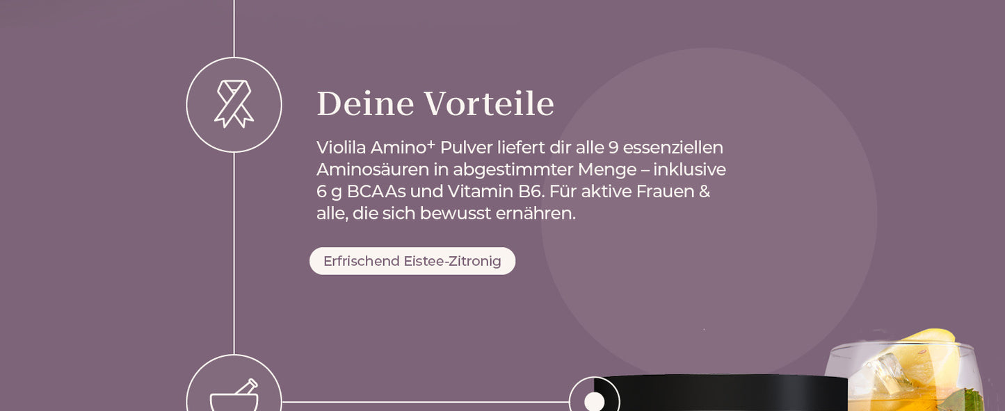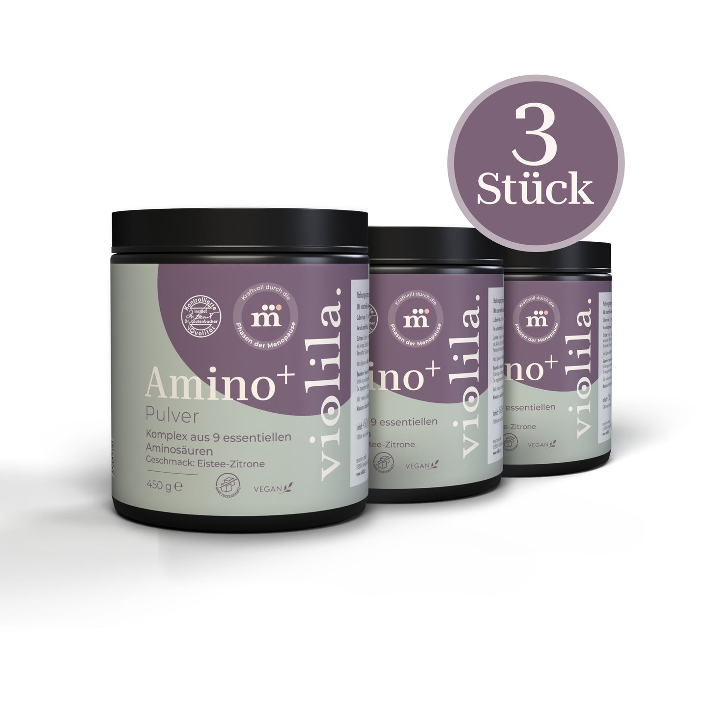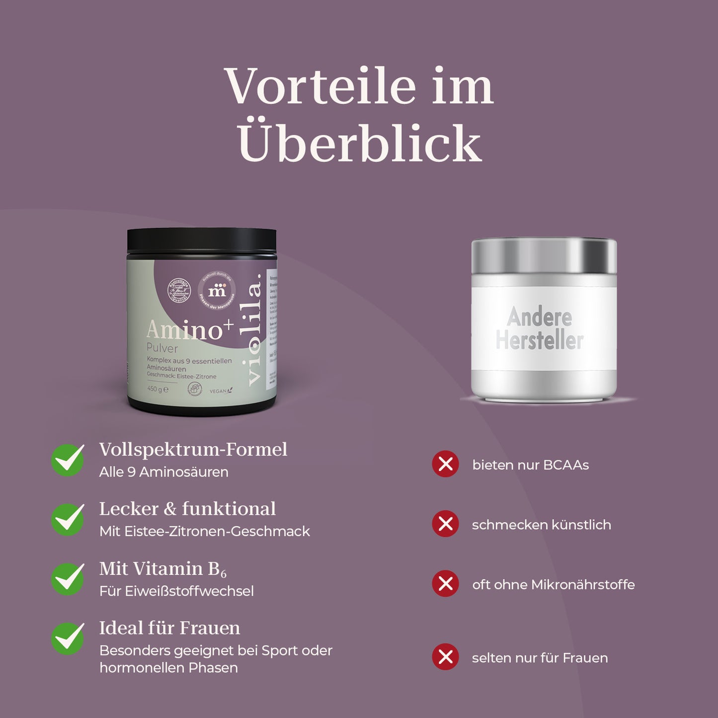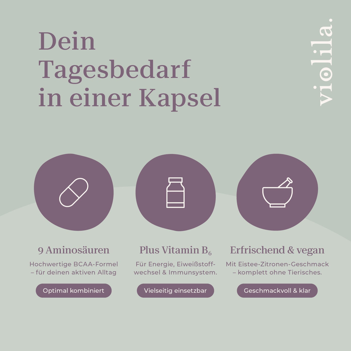 Violila Amino⁺ Pulver liefert alle neun essenziellen Aminosäuren in optimaler Kombination: Leucin, Isoleucin, Valin (als BCAAs), sowie Lysin, Methionin, Threonin, Phenylalanin, Histidin und Tryptophan. Diese Aminosäuren kann der Körper nicht selbst herstellen – sie müssen regelmäßig über die Ernährung aufgenommen werden. Mit 3 g Leucin pro Portion ist die Formulierung speziell für aktive Frauen geeignet, die Muskelversorgung, Erholung und körpereigene Proteinsynthese bewusst unterstützen möchten. Ergänzt wird die Formel durch Vitamin B6, das zur Verringerung von Müdigkeit und Ermüdung beiträgt, den Energiestoffwechsel unterstützt und zu einem normalen Eiweißstoffwechsel beiträgt. Dank des angenehmen Eistee-Zitronen-Geschmacks lässt sich das Pulver leicht trinken – ob rund ums Training oder als Teil einer aktiven, proteinreichen Ernährung.Wie kann Amino⁺ in meine Ernährung integriert werden?